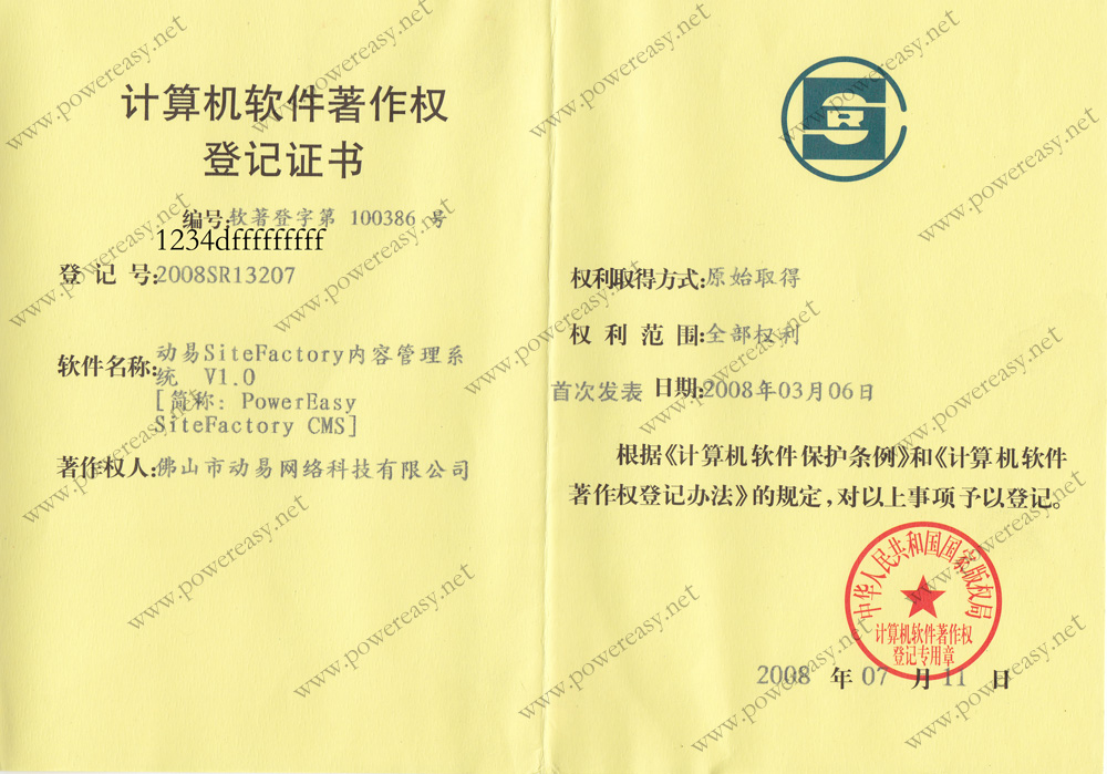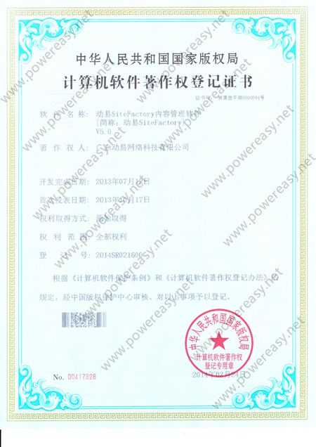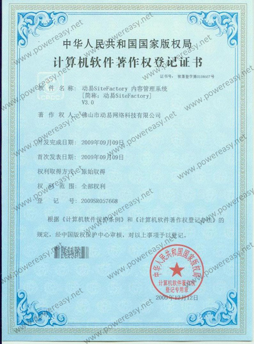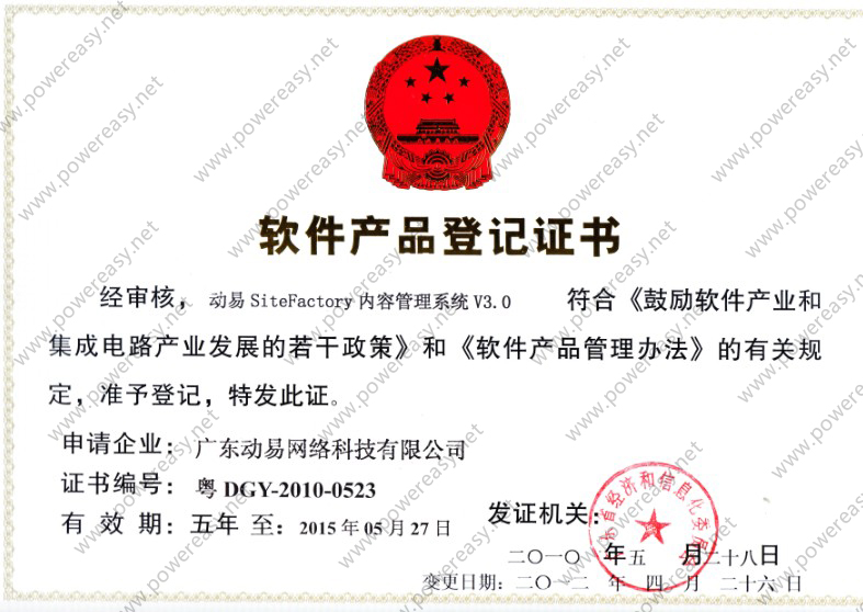 • 軟件產(chǎn)品登記證書 動易SiteFactory內(nèi)容管理系統(tǒng)V3.0