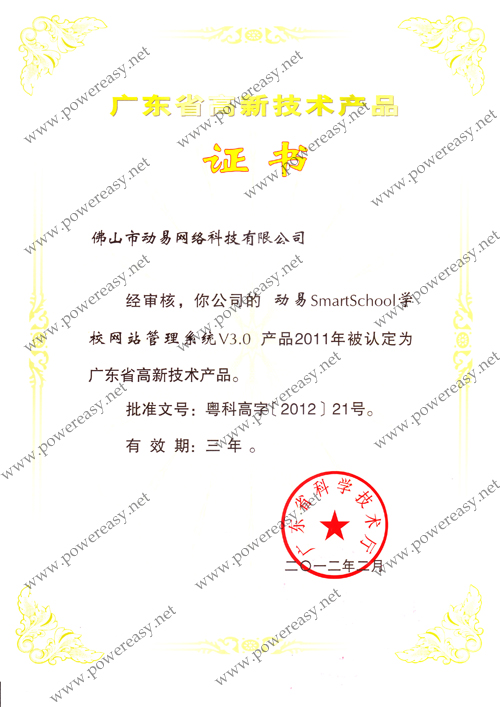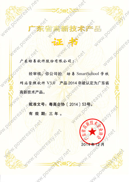 • 廣東省自主創(chuàng)新產(chǎn)品認(rèn)定證書 動易SmartSchool V3.0