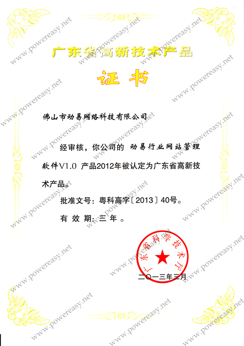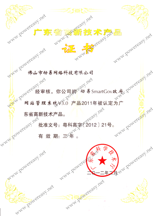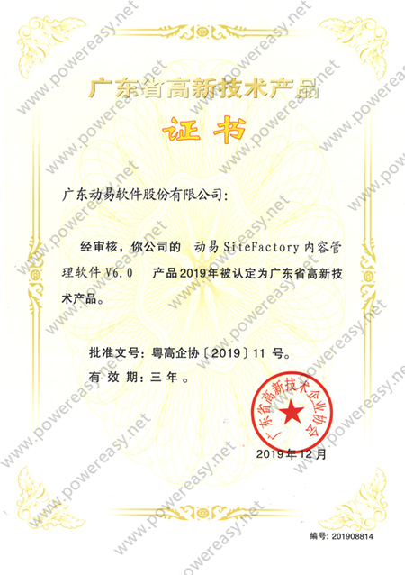 • 廣東省自主創(chuàng)新產(chǎn)品認(rèn)定證書 動易SiteFactory V3.0