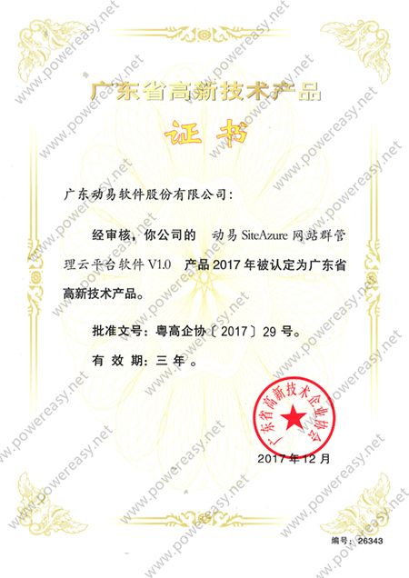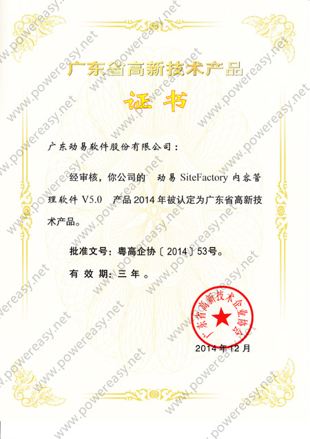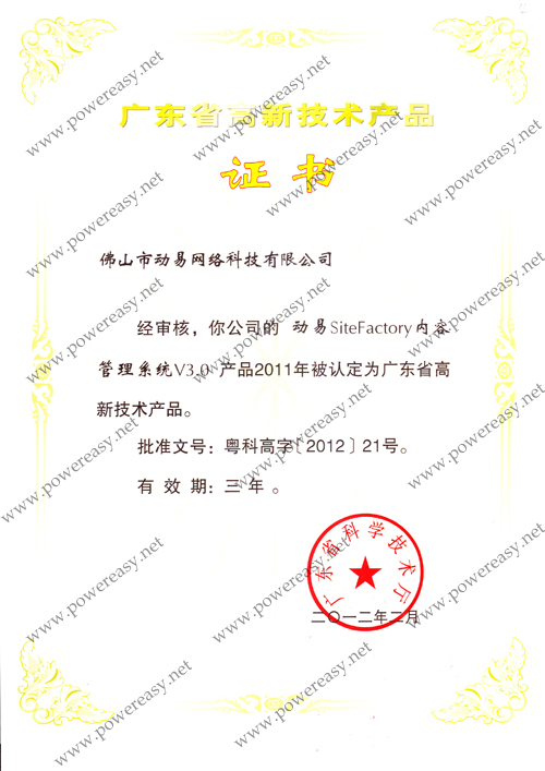 • 2010年廣東省高新技術(shù)產(chǎn)品 (SiteFactory)證書