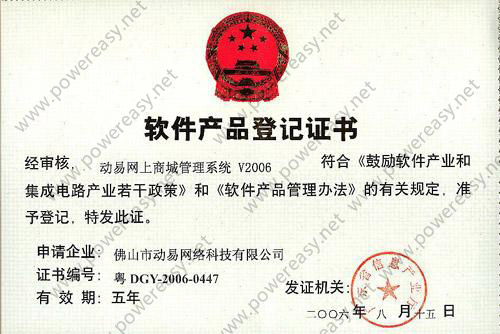 軟件產(chǎn)品登記證書 動易網(wǎng)上商城管理系統(tǒng)V2006