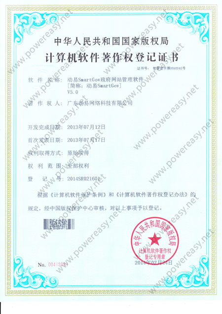 軟件產(chǎn)品登記證書 動易SmartGov政府網(wǎng)站管理系統(tǒng)V3.0