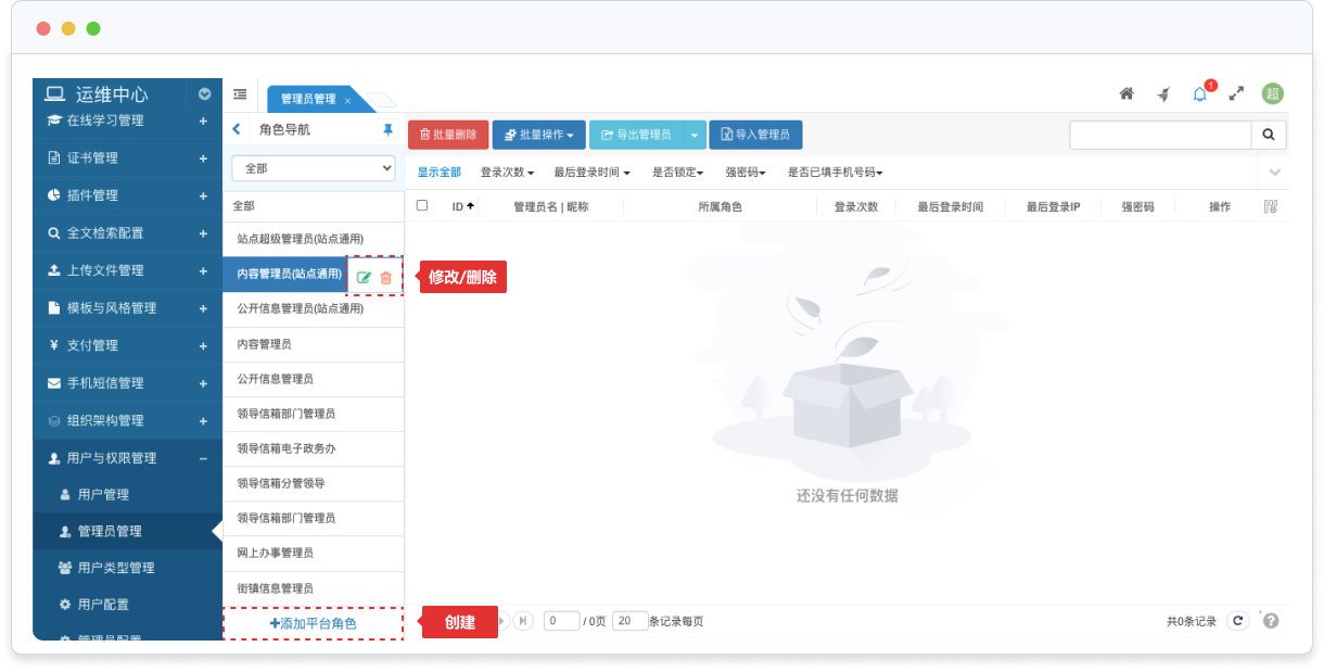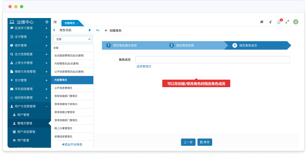 • 可以在創(chuàng)建/修改角色時(shí)指定角色成員,或者在管理員管理時(shí)設(shè)置管理員的權(quán)限(所屬角色)。