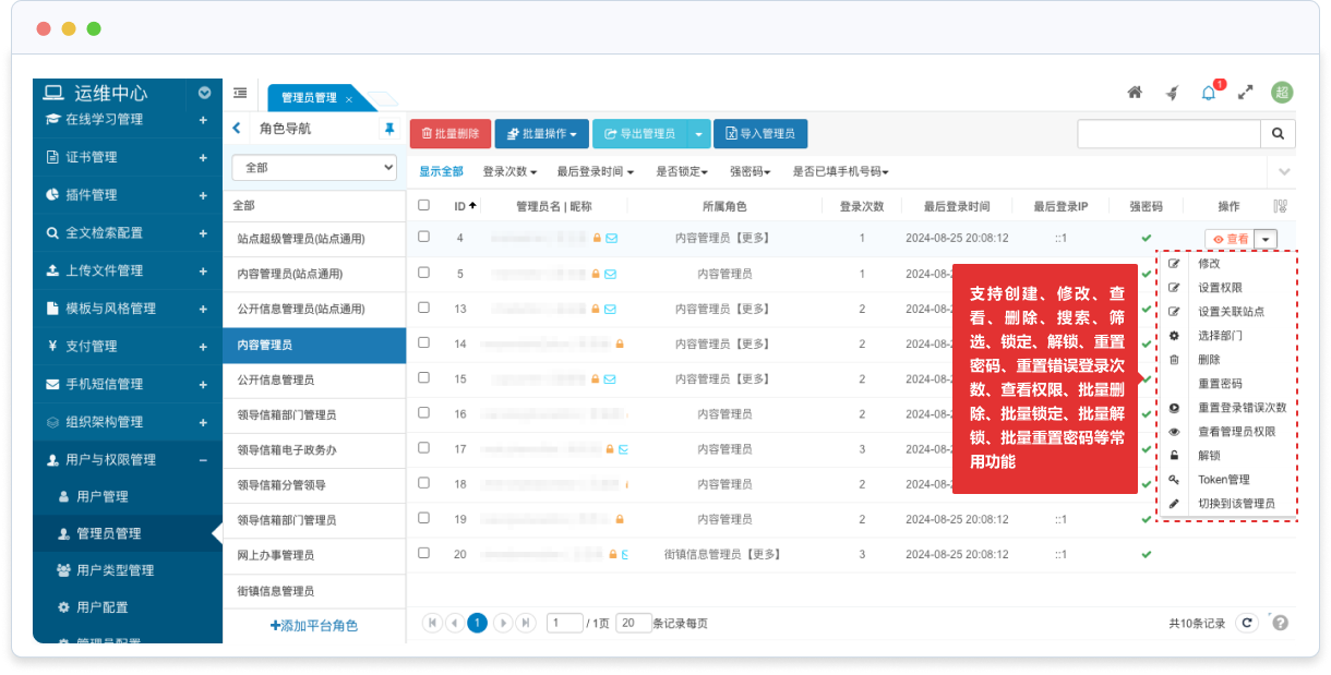 • 支持創(chuàng)建、修改、查看、刪除、搜索、篩選、鎖定、解鎖、重置密碼、重置錯(cuò)誤登錄次數(shù)、查看權(quán)限、批量刪除、批量鎖定、批量解鎖、批量重置密碼等常用功能;
