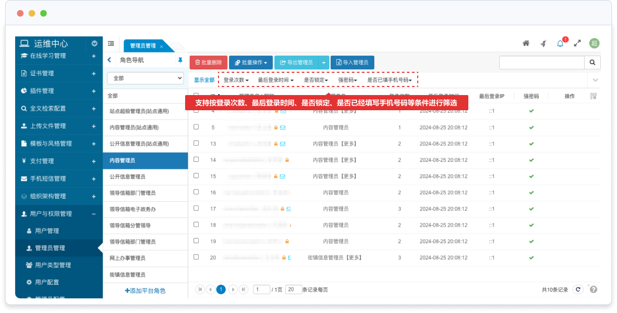 • 支持按登錄次數(shù)、最后登錄時(shí)間、是否鎖定、是否已經(jīng)填寫手機(jī)號碼等條件進(jìn)行篩選;