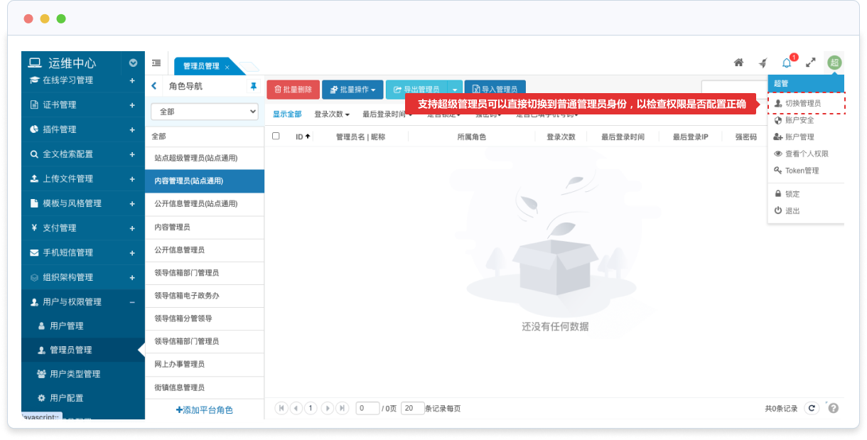 • 支持超級管理員可以直接切換到普通管理員身份,以檢查權(quán)限是否配置正確;
