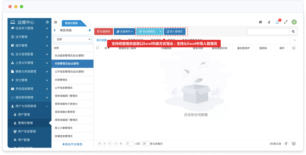 • 支持將管理員信息以Excel列表方式導(dǎo)出;支持從Excel中導(dǎo)入管理員。