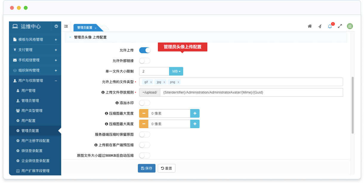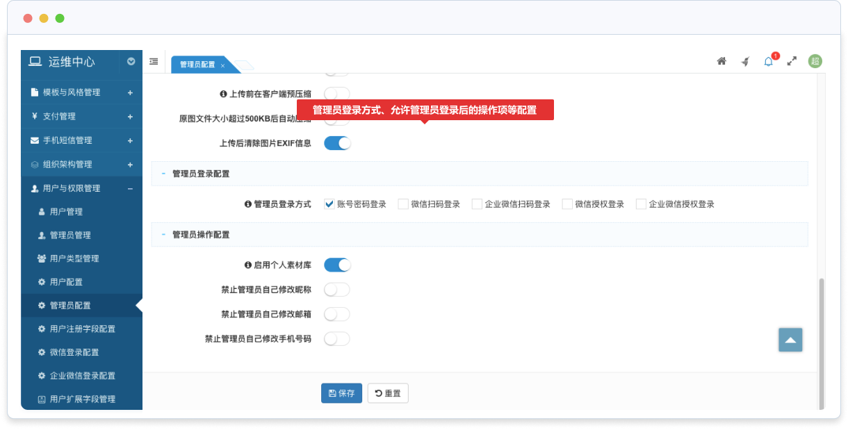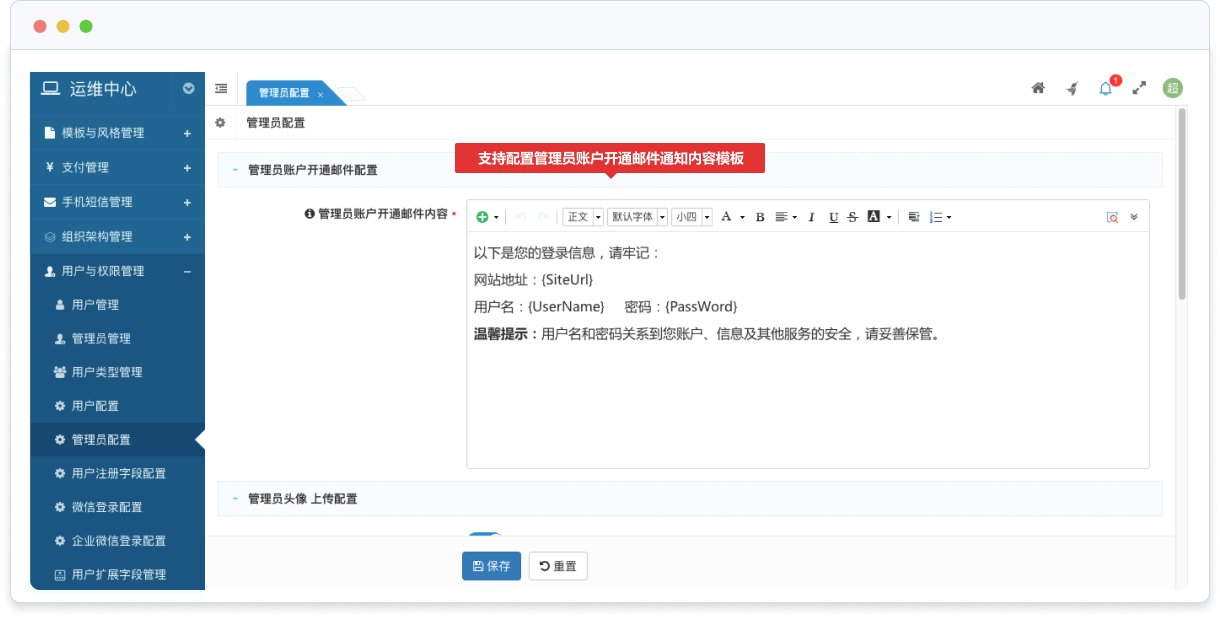 • 支持配置管理員賬戶開通郵件通知內(nèi)容模板、管理員頭像上傳配置、管理員登錄方式、允許管理員登錄后的操作項(xiàng)等配置。
