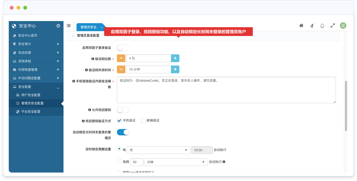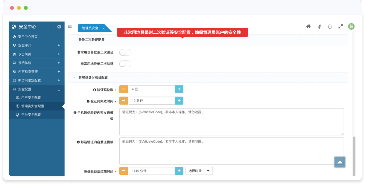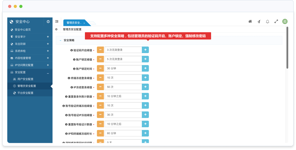 • 支持配置多種安全策略,包括管理員的驗(yàn)證碼開啟、賬戶鎖定、強(qiáng)制修改密碼、啟用雙因子登錄、找回密碼功能、以及自動(dòng)鎖定長時(shí)間未登錄的管理員賬戶、非常用設(shè)備登錄時(shí)二次驗(yàn)證和非常用地登錄時(shí)二次驗(yàn)證等安全配置,確保管理員賬戶的安全性。