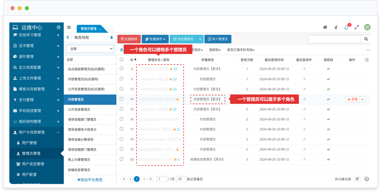 管理員可以歸屬于多個(gè)站點(diǎn),在每個(gè)站點(diǎn)中可以屬于不同站點(diǎn)角色,以滿足跨站點(diǎn)管理的業(yè)務(wù)需求。