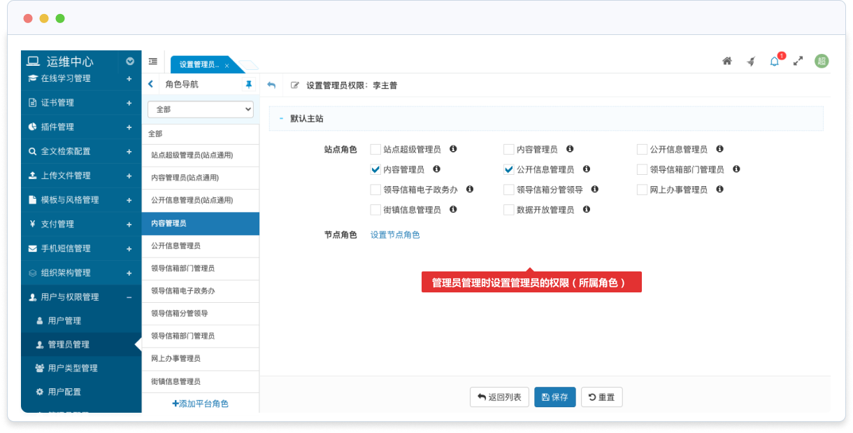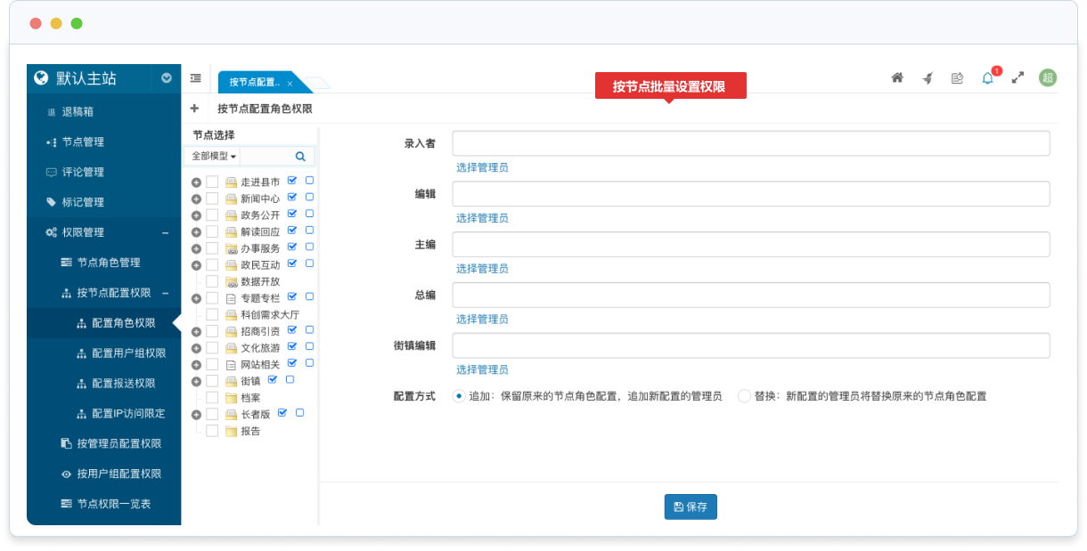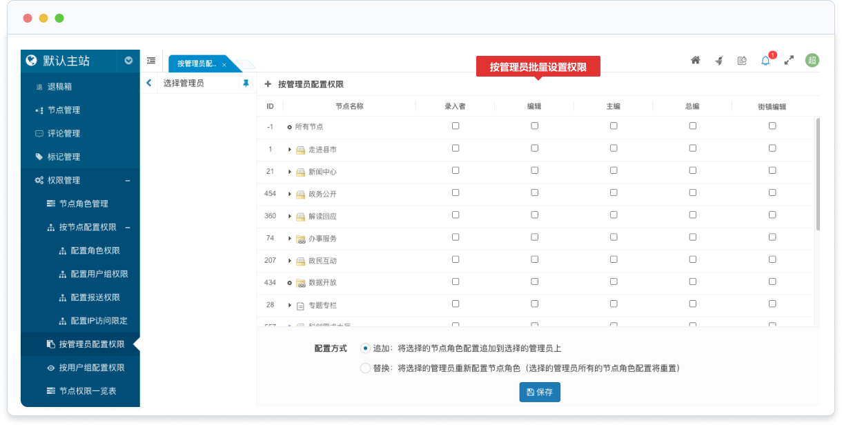 • 通過配置各欄目(節(jié)點(diǎn))節(jié)點(diǎn)角色的管理員,可以為不同欄目指派特定管理員進(jìn)行管理