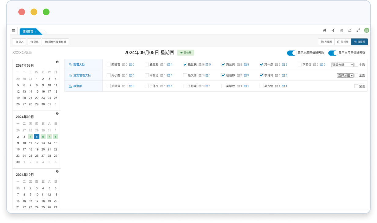 - 排班時(shí),支持按日期為每個(gè)部門(mén)設(shè)置值班人員,支持在設(shè)置值班人員時(shí)直觀查看有關(guān)人員的當(dāng)周值班情況和當(dāng)月累計(jì)值班天數(shù),以幫助排班人員做出更好的決策。