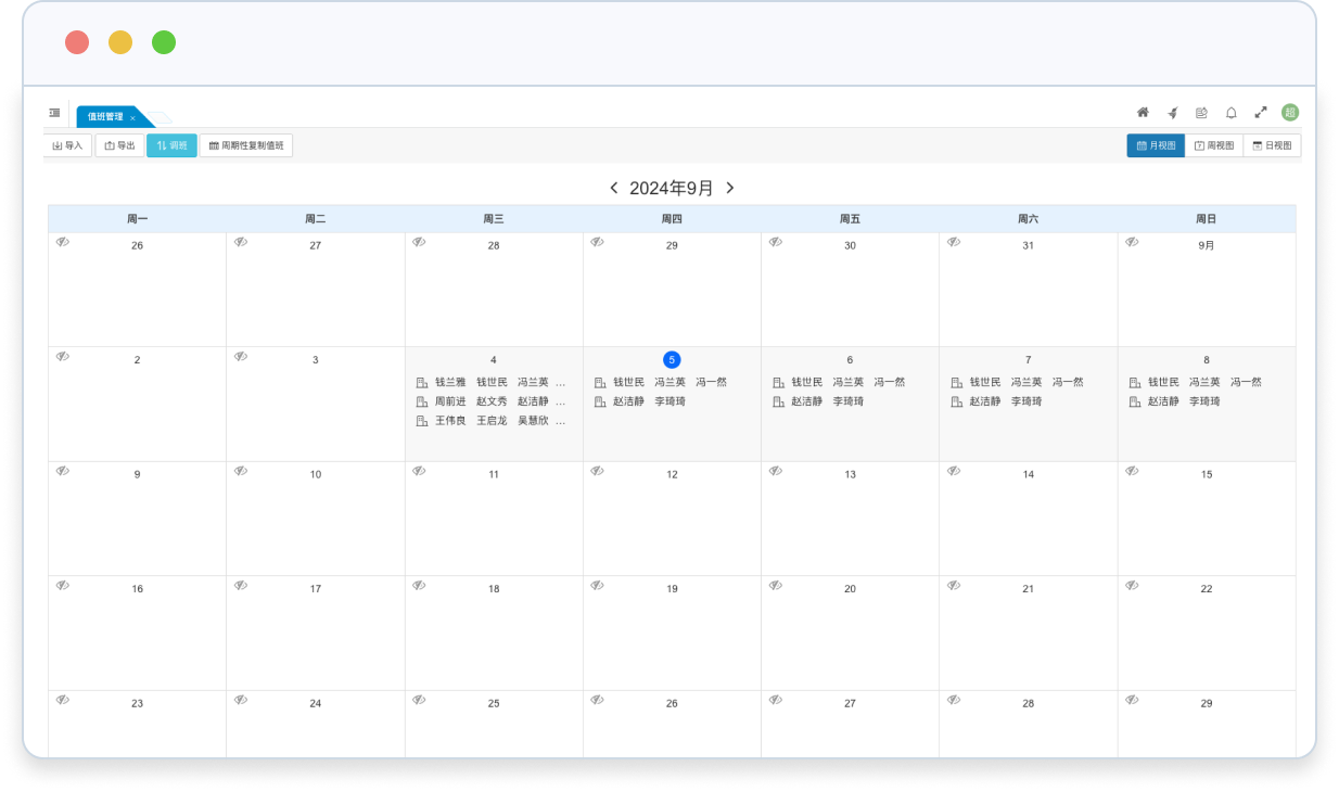 - 所見(jiàn)即所得的排班界面,提供日/周/月視圖排班模式,適配不同規(guī)模人員調(diào)度;