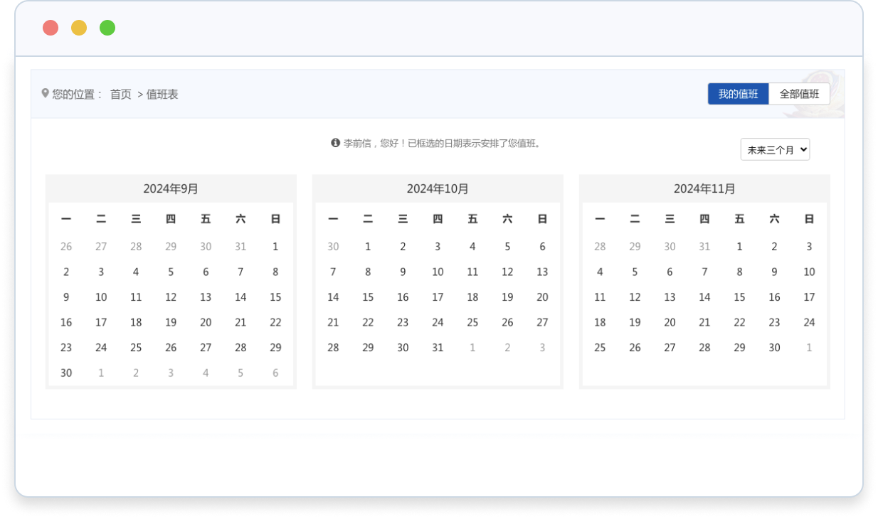 - 支持“我的值班”,當(dāng)用戶已登錄時(shí),可訪問(wèn)“我的值班”頁(yè)面,頁(yè)面以日歷方式顯示當(dāng)前用戶的值班安排。