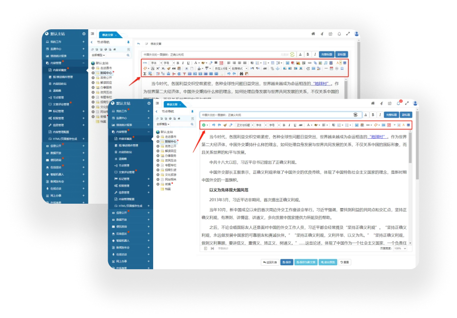 在線 HTML 編輯器是內(nèi)容管理系統(tǒng)的最核心功能之一,它采用與 Word 類似的可視化編輯方式,實(shí)現(xiàn)對(duì)文章內(nèi)容的“所見即所得”的在線編輯效果。