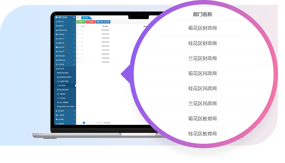 支持按所屬行政區(qū)域進(jìn)行篩選,管理人員能夠基于地理位置或行政區(qū)劃輕松篩選出相應(yīng)部門,提升了管理的便捷性和精確度。