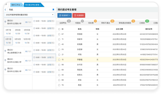 支持按照面試地點、日期、時間段進(jìn)行篩選;可直觀查看相應(yīng)的名額和已報名人數(shù);