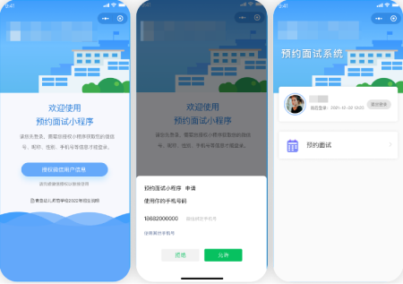 面試學(xué)生通過微信登錄后可以在小程序上完成整個預(yù)約面試流程:預(yù)約面試、預(yù)約記錄、報到、查看面試排隊情況、查看面試結(jié)果。