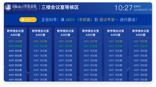 支持顯示正在面試、準(zhǔn)備面試、排隊中的考生,并負(fù)責(zé)播放叫號語音;