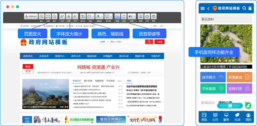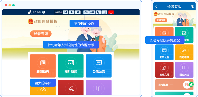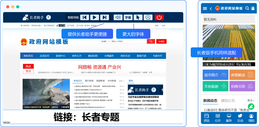 內(nèi)置了無(wú)障礙訪問(wèn)系統(tǒng)和長(zhǎng)者助手,專(zhuān)門(mén)提供了長(zhǎng)者版模板和長(zhǎng)者專(zhuān)題(適老專(zhuān)區(qū)),讓老年人、功能障礙人士等特殊訪問(wèn)對(duì)象也可以獲得最佳的訪問(wèn)體驗(yàn)。認(rèn)真對(duì)照無(wú)障礙和適老化方面的國(guó)家規(guī)范、評(píng)測(cè)和認(rèn)證標(biāo)準(zhǔn)對(duì)頁(yè)面模板進(jìn)行了全面優(yōu)化,以保證符合有關(guān)國(guó)家規(guī)范和標(biāo)準(zhǔn)。