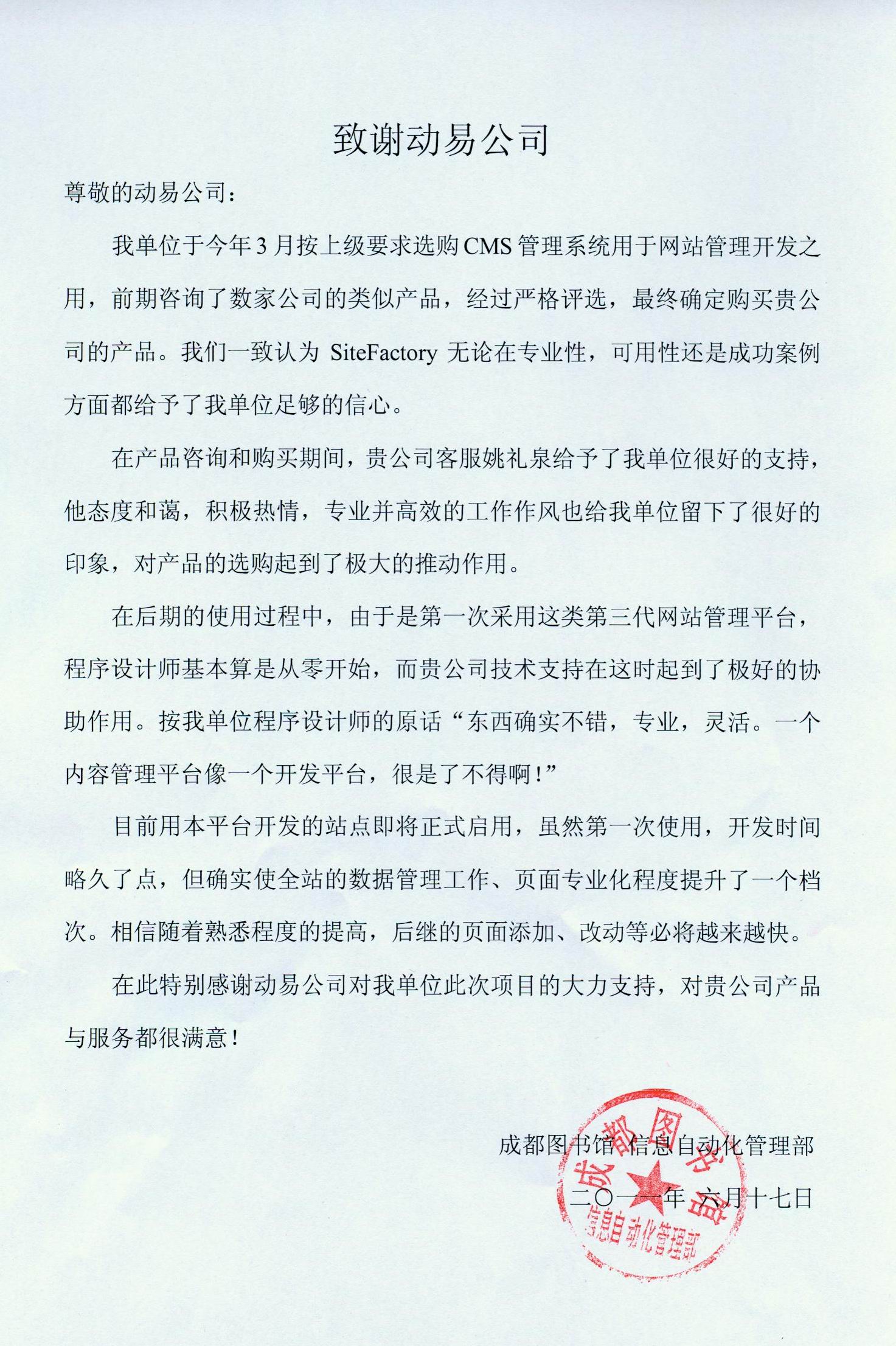 二零一一年六月十七日,動易公司收到一封來自成都圖書館發(fā)來的感謝信,客戶在信中充分表達(dá)了對動易客服姚禮泉和技術(shù)支持人員的深深謝意,同時也對動易產(chǎn)品做出了很高的評價。