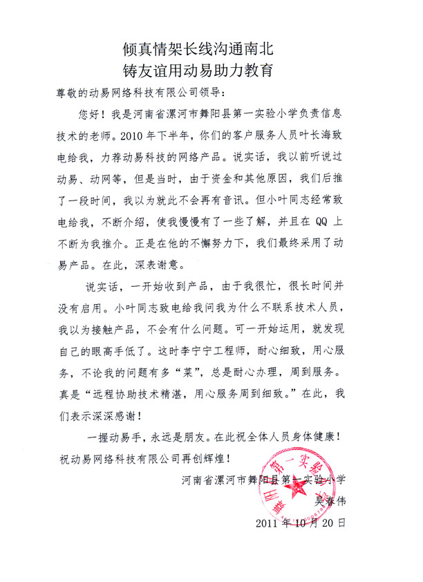 河南省漯河市舞陽縣第一實(shí)驗(yàn)小學(xué)于今年5月選擇了動易軟件產(chǎn)品作為校園網(wǎng)軟件平臺,購買前期 ,客戶對于動易客服人員葉長海的用心服務(wù),始終站在客戶發(fā)展角度,想客戶所想的專業(yè)素質(zhì)表達(dá)了贊賞和感謝。之后,動易的技術(shù)工程師李寧寧在售后技術(shù)支持服務(wù)中用心、耐心細(xì)致的為客戶解決問題,服務(wù)非常到位和盡心,又得到客戶的不斷好評。