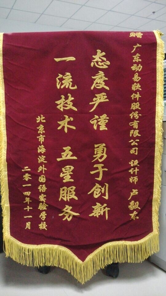 近日,北京市海淀外國(guó)語實(shí)驗(yàn)學(xué)校將一面代表學(xué)校謝意的錦旗送到了動(dòng)易公司設(shè)計(jì)師盧毅東的手上,嶄新的錦旗上書“態(tài)度嚴(yán)謹(jǐn) 勇于創(chuàng)新 一流技術(shù) 五星服務(wù)”幾行大字,表達(dá)了對(duì)動(dòng)易設(shè)計(jì)師盧毅東在海淀外國(guó)語實(shí)驗(yàn)學(xué)校網(wǎng)站建設(shè)多期項(xiàng)目中優(yōu)質(zhì)服務(wù)的感謝之情。