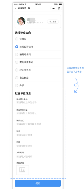 畢業(yè)生根據(jù)本人實(shí)際情況,選擇當(dāng)前狀態(tài)(待就業(yè)、簽就業(yè)協(xié)議書、前勞動(dòng)合同、其他錄用形式、應(yīng)征義務(wù)兵、自主創(chuàng)業(yè)、升學(xué)),小程序按照選擇的不同形態(tài)提供不同的表單、選項(xiàng)供畢業(yè)生填寫。