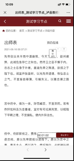 學習者學習文章、視頻等學習資源時,平臺會會顯示一個學習時長計時器,顯示已經學習了多久時間。如果用戶長時間不動頁面,系統(tǒng)則會彈窗要求手動點擊按鈕,以確認用戶是否還在屏幕前學習。