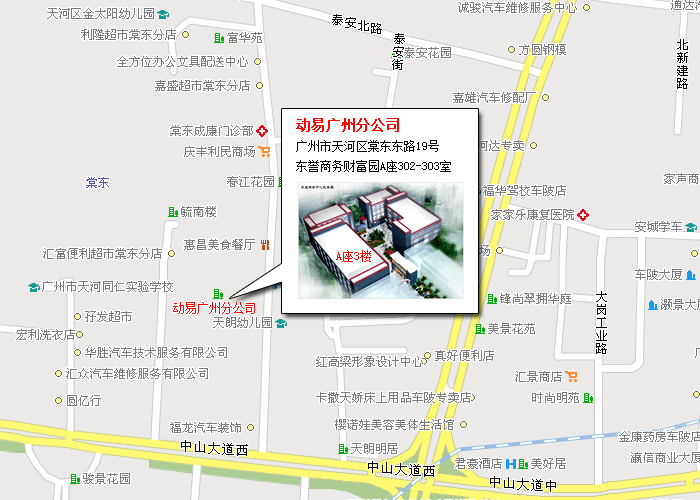 動易廣州分公司新址位于位于廣州天河區(qū)棠東東路的“東譽商務財富園”,辦公面積近500平方。棠東東路與黃埔大道與中山大道相連,周圍有棠東、棠下、東圃等居民區(qū)和駿景花園、天朗明居、春江花園等小區(qū)。有296路、515路、210路、883路等數(shù)十條公交經(jīng)過,2009年底前將開通的地鐵五號線在附近設有車陂站地鐵口,交通與生活十分便利。