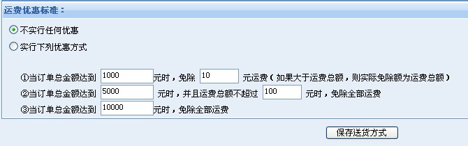 按重量計(jì)算運(yùn)費(fèi)時(shí),可以按同一城市間運(yùn)費(fèi)標(biāo)準(zhǔn)、同一區(qū)域間(比如珠江三角州、長(zhǎng)江三角州等特別區(qū)域)的運(yùn)費(fèi)標(biāo)準(zhǔn)、同一省份間運(yùn)費(fèi)標(biāo)準(zhǔn)、外省運(yùn)費(fèi)標(biāo)準(zhǔn)和國(guó)際運(yùn)費(fèi)標(biāo)準(zhǔn)進(jìn)行設(shè)置,每種運(yùn)費(fèi)計(jì)算方式均可設(shè)置基本運(yùn)費(fèi)、基本運(yùn)費(fèi)的起算重量、浮動(dòng)運(yùn)費(fèi)和最高運(yùn)費(fèi),同時(shí)也可設(shè)置運(yùn)費(fèi)優(yōu)惠標(biāo)準(zhǔn)。