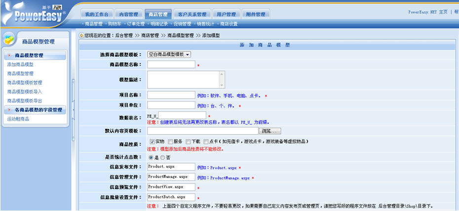 動(dòng)易eShop2007的商品添加采用了這樣的步驟:1、添加商品模型;2、添加商品節(jié)點(diǎn)與欄目;3、添加商品。商品模型的定義是商品上架的首要一步:商店管理——商店設(shè)置——商品模型管理——添加商品模型。