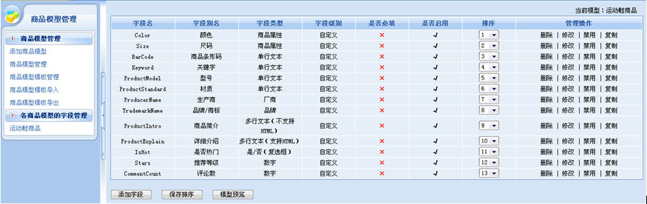 這里主要是定義商品模型的名稱、數(shù)據(jù)表名、商品性質(zhì)等內(nèi)容。添加完商品模型后,我們需要為模型設(shè)計(jì)字段,也就是我們常見(jiàn)的為該商品模型的數(shù)據(jù)庫(kù)表設(shè)計(jì)字段:商店管理——商店設(shè)置——商品模型管理——各商品模型的字段管理。