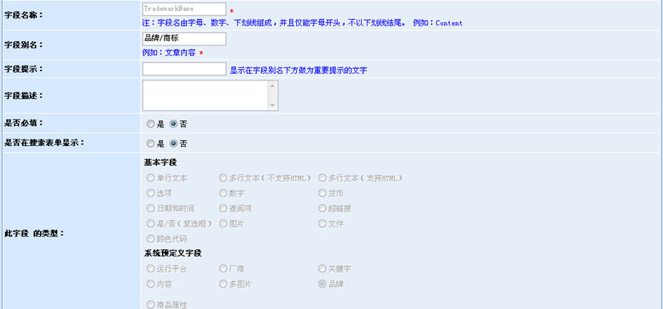 這里有字段名稱、提示、是否必填、字段類型等內(nèi)容需要我們進(jìn)行定義。動(dòng)易eShop2007將商品的數(shù)據(jù)庫(kù)表的修改權(quán)限完全開(kāi)放了出來(lái),以實(shí)現(xiàn)最大程度的用戶自定義,滿足不同的網(wǎng)店商品的需求。特別地,我們看到字段類型有一些“奇怪”的名詞,如:多行文本(支持HTML)、顏色代碼、圖片、超鏈接、文件等。這些并不是數(shù)據(jù)庫(kù)字段的類型,而是eShop2007內(nèi)置好的一些功能,用于在商品模型里自定義使用HTML編輯器、顏色代碼選擇器、圖片上傳、文件上傳等。也就是說(shuō),動(dòng)易eShop把諸多以前固定的封裝的功能都開(kāi)發(fā)出來(lái)了,實(shí)現(xiàn)了這些功能調(diào)用的自定義,極大地賦予了系統(tǒng)的自由性。