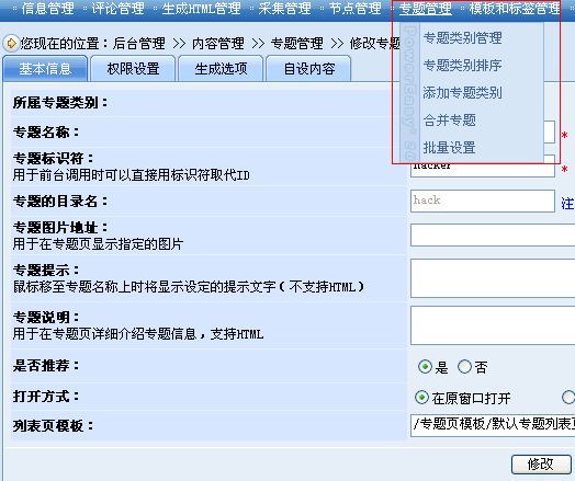 比如我們需要為近期頻繁的黑客攻擊事件進(jìn)行一個專題報(bào)道,于是進(jìn)入專題管理,建立“黑客專題”(如下圖)。特別注意圖中紅色框內(nèi)的內(nèi)容“專題標(biāo)識符”,圖中所示填寫的是“hacker”,那么如果前臺需要調(diào)用所有關(guān)于黑客的文章,只需要在調(diào)用標(biāo)簽中輸入“hacker”即可。
