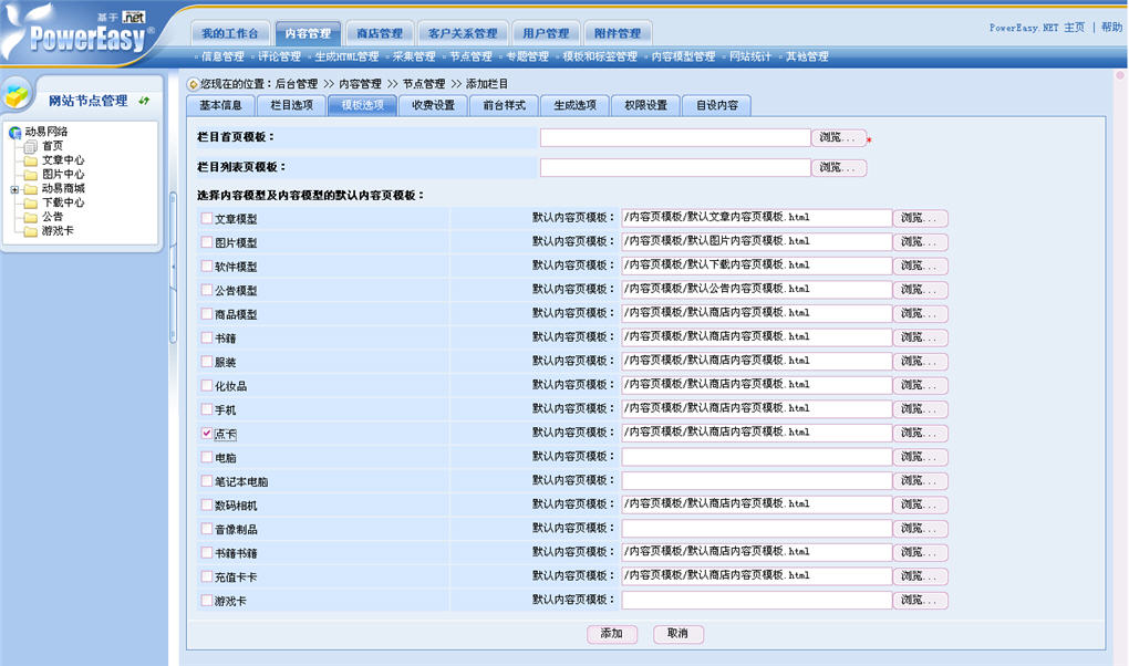 建好商品模型之后,我們還需要在商城下添加一個游戲充值卡的商品欄目,并選擇設(shè)置好該欄目的內(nèi)容模型(即商品模型)與欄目模板。