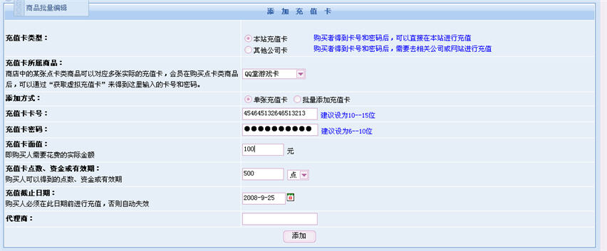 最后就是需要添加充值卡了,需要到“充值卡管理”里面添加單張充值卡或者批量生成充值卡。需要注意的是要正確選擇充值卡所屬商品,也就是所生成的充值卡要對應屬于上面所添加的充值卡商品,否則充值卡將無法正常出售。另外“充值卡點數(shù)、資金或有效期”也要注意要與所屬商品中所描述的點數(shù)相同。