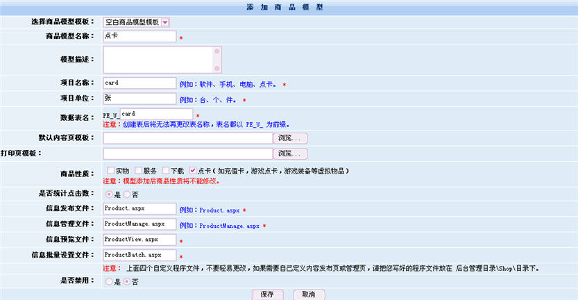 首先,我們需要添加一個點卡類的商品模型。這里,尤其要注意的是需要將“商品性質(zhì)”勾為選“點卡”,否則將無法使用點卡銷售的功能。