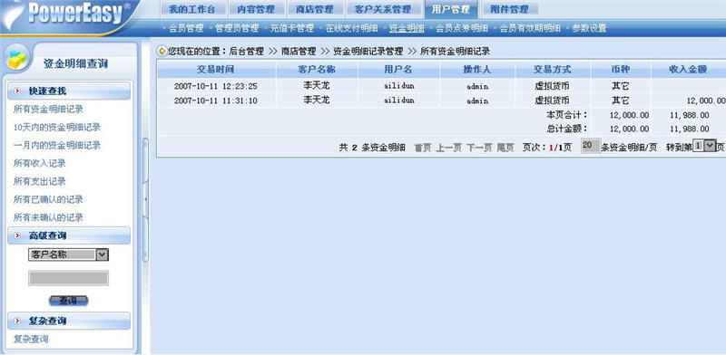 在網(wǎng)店中,在線的支付方式是最為普遍的支付方式,大多顧客都會(huì)選擇和使用此種方式來支付,于是在動(dòng)易eShop2007用戶管理模塊中單獨(dú)設(shè)定了“在線支付明細(xì)”功能。