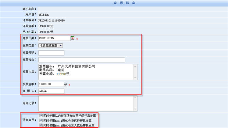 點(diǎn)擊開發(fā)票按鈕后,商家進(jìn)入開發(fā)票表單填寫開票信息。在這里,系統(tǒng)還提供了開具發(fā)票的短信通知功能。已添加的開票信息會(huì)在對(duì)應(yīng)的訂單信息中顯示出來