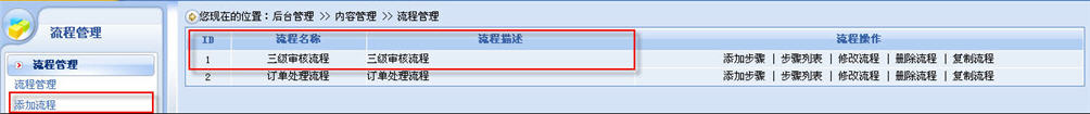 添加完稿件狀態(tài)后,我們就可以開始為稿件添加工作流程了,操作步驟為:登錄系統(tǒng)后臺(tái)——內(nèi)容管理——內(nèi)容模型管理——流程管理。這里,我們添加的是一個(gè)三級(jí)審核流程。