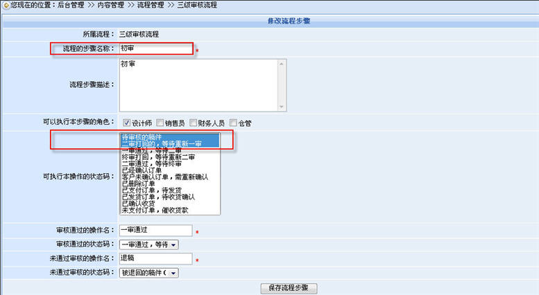 在添加步驟的頁面里,我們根據(jù)所設(shè)計(jì)的三級(jí)審核流程來指定該步驟的各種參數(shù),如:步驟名稱、可執(zhí)行本步驟的角色、哪種狀態(tài)的稿件可以執(zhí)行本步驟的操作、通過(不通過)該步驟的操作的命名、通過(不通過)該步驟的稿件狀態(tài)等。