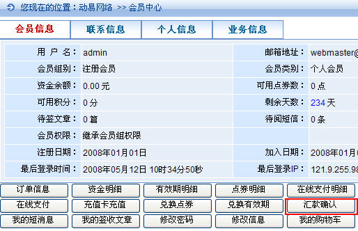 顧客希望發(fā)送匯款確認(rèn)信息給商家需登錄會員中心??紤]到SF eShop和CMS都需要匯款確認(rèn)的功能,在會員中心里,會員發(fā)送匯款確認(rèn)信息有2個地方,一個是在會員中心首頁點擊“匯款確認(rèn)”按鈕。這里主要是應(yīng)用于非商品訂單類的匯款,如:預(yù)付款、保證金或者希望用于購買網(wǎng)站點券的資金等。見下圖: