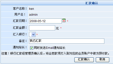 另外一個匯款確認(rèn)的功能按鈕則是為商品訂單獨立設(shè)計的:會員的訂單信息——>點擊“我已匯款”按鈕——>添加該筆訂單的匯款確認(rèn)信息,見下圖: