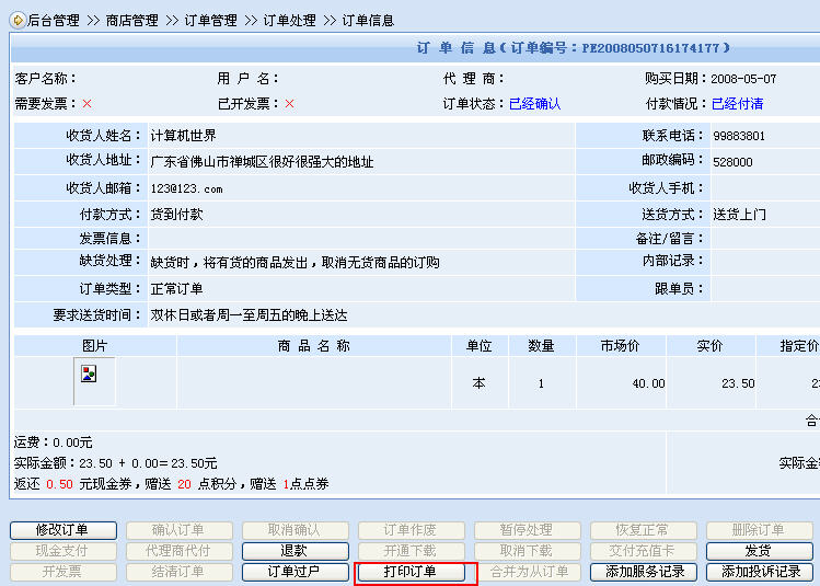 動易SF eShop的單據(jù)打印是和處理流程緊密結(jié)合的。訂單打印在訂單處理環(huán)節(jié)里,發(fā)貨單打印在發(fā)貨處理環(huán)節(jié)里,合理方便。當(dāng)然,如果再增加一個單獨的單據(jù)打印功能可能也不錯,當(dāng)我們批量要打印單據(jù)的時候能很快打印出來。