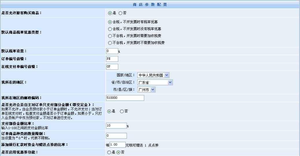 圖1。這是商店參數(shù)配置的一部分截圖,在這部分里,主要配置了商店的一些常用功能選項(xiàng)的開(kāi)關(guān)與參數(shù),比如:含稅、部分支付訂單、區(qū)域、郵編、是否啟用優(yōu)惠券、支付金額比率(每次支付不得少于商品總額的多少)……等等。