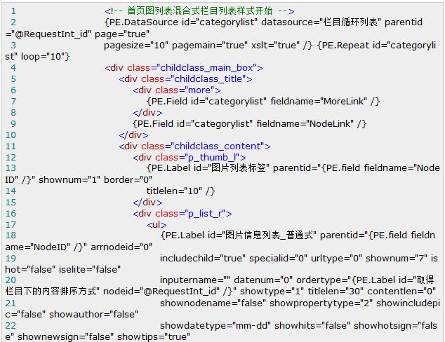 如上圖我們要實現(xiàn)每兩個欄目就加入一個廣告圖片,如何實現(xiàn)呢?首先我們打開SiteFactory? CMS 1.1的“圖片首頁模板”,在代碼中找到欄目循環(huán)開始的地方,代碼如下: