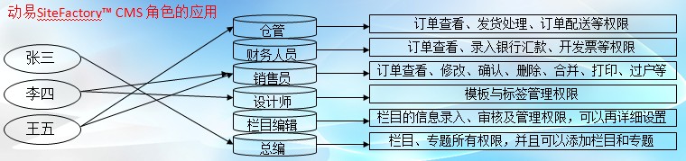 動易SiteFactory? CMS的角色是通過標(biāo)準(zhǔn)RBAC(基于角色的訪問控制)模型實現(xiàn)的,下圖為SiteFactory? CMS中角色應(yīng)用舉例示意圖。我們建立了“倉管”、“財務(wù)人員”、“銷售員”、“設(shè)計師”、“欄目編輯”、“總編”等角色,并且它們都具有相對獨立的控制權(quán)限。將張三、李四、王五賦予不同的角色后,他們就擁有了一系列權(quán)限。從圖中看出用戶與角色是多對多的關(guān)系。即一個用戶可以屬于多個角色之中,一個角色可以包括多個用戶。